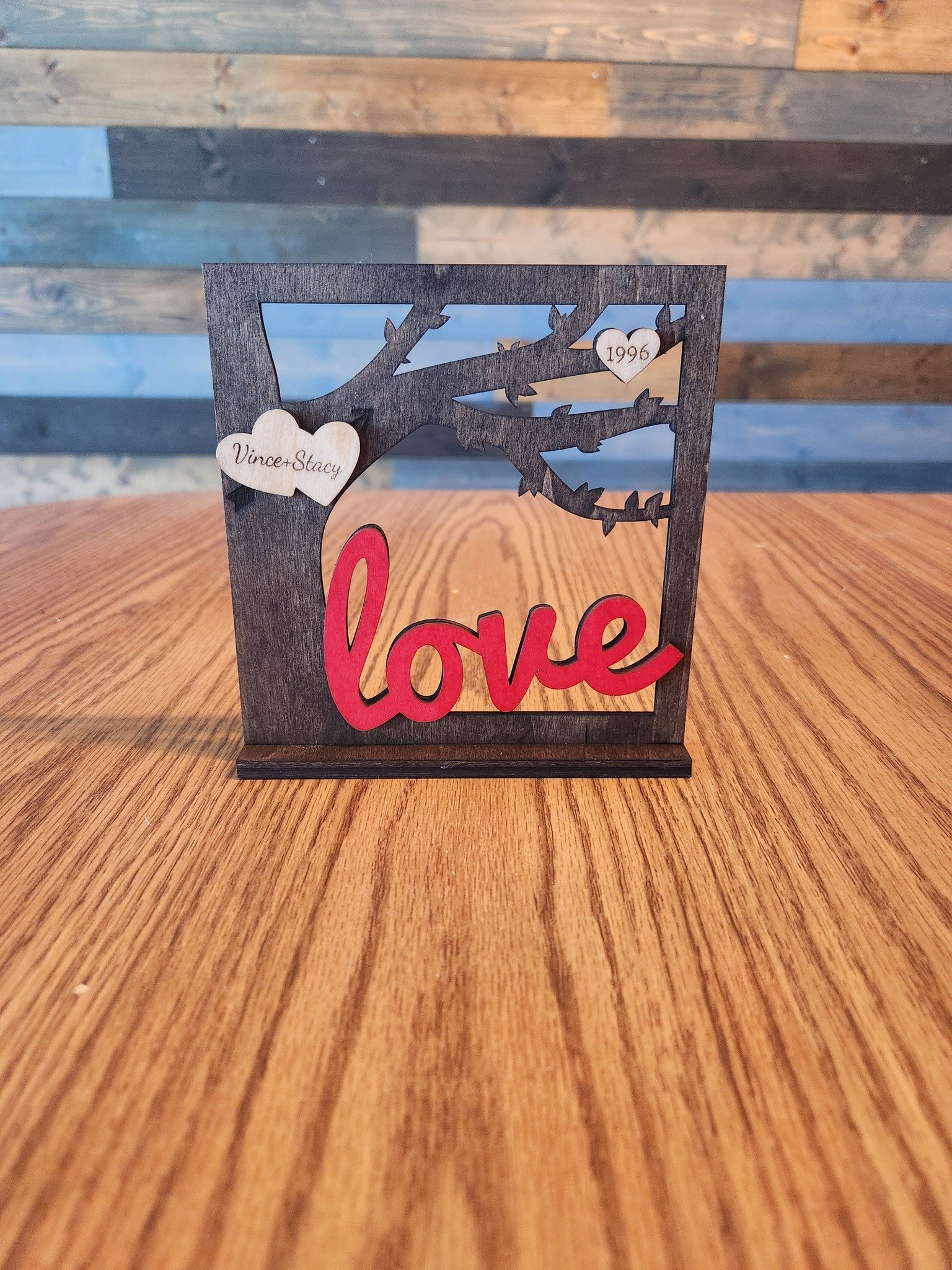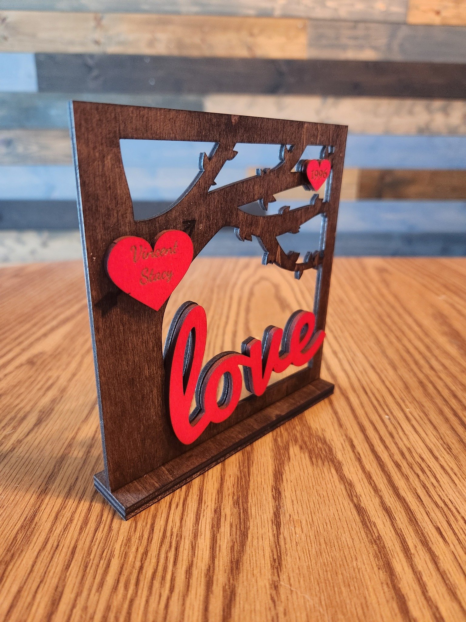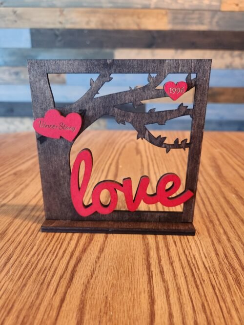 Choose between two distinct design styles—single or double heart placements for the personalized names—to perfectly match your preferences or the occasion. An additional heart on the limb provides space for a meaningful date, making this piece even more special for anniversaries or significant milestones. Adding to the artistic appeal, the hearts can either be lightly stained for a subtle elegance or painted red to complement the bold “love” text next to the tree. With these customizable features, you can truly make this decoration uniquely yours or meaningful for someone special.