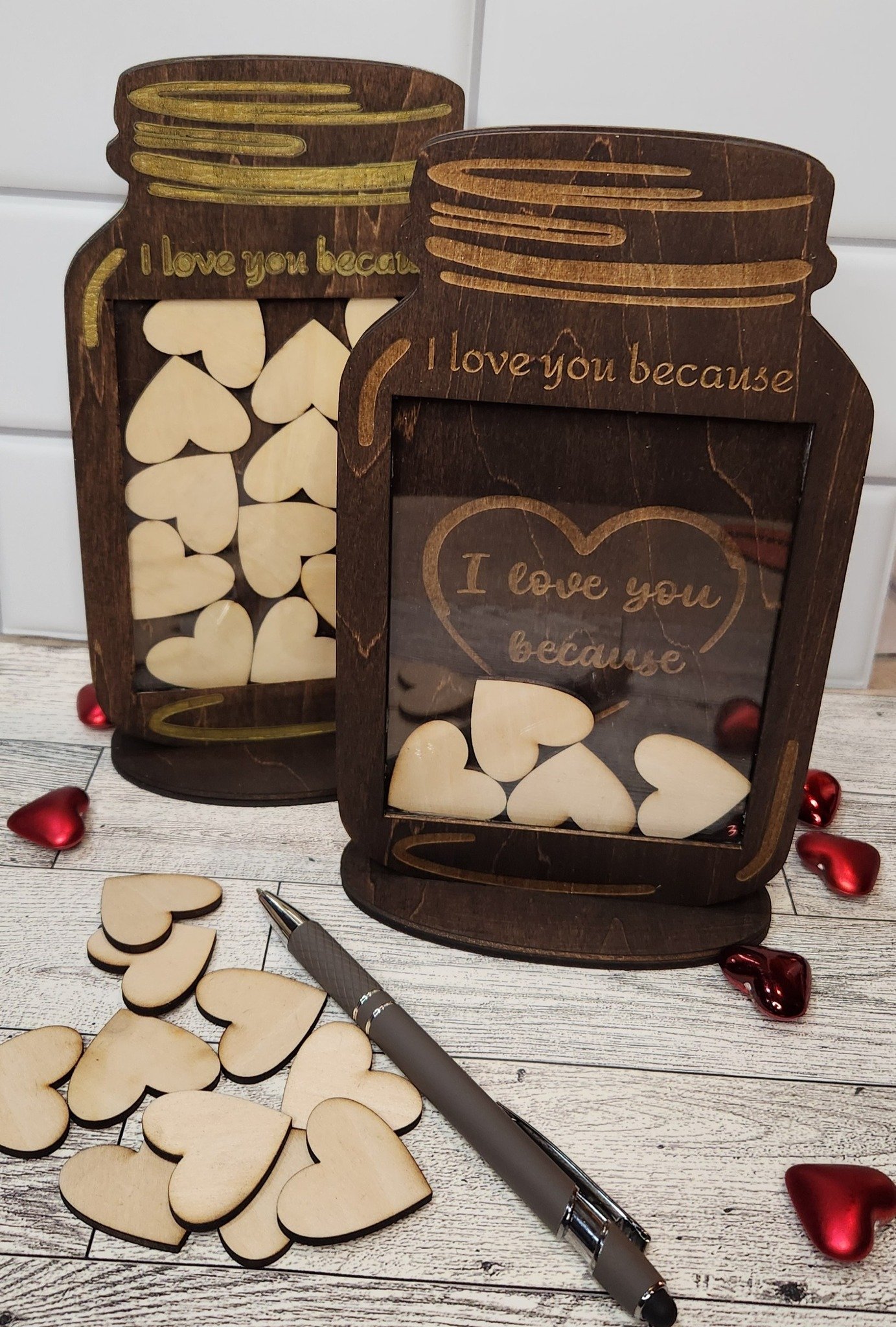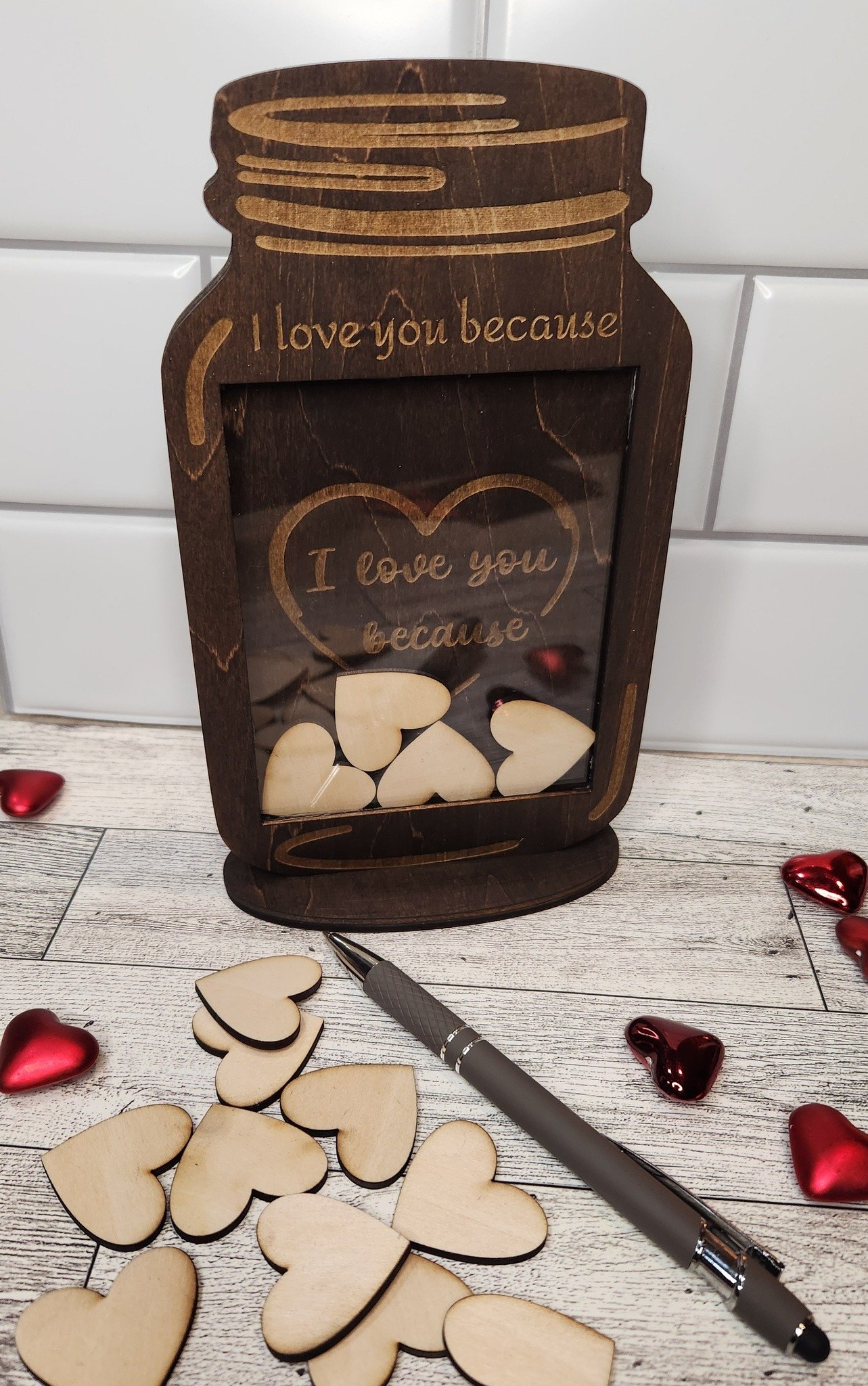 Discover a unique and heartwarming way to express your affection with our beautifully crafted wooden jar and stand. This one-of-a-kind keepsake offers an elegant solution to showcasing the reasons why your loved one holds a special place in your heart. With its timeless design and customizable features, this product is an ideal gift to mark milestone occasions, romantic gestures, or simply to brighten someone’s day.