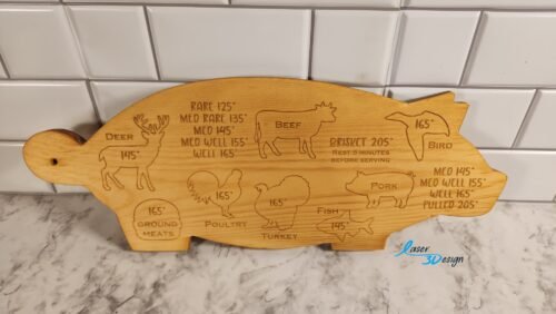 This Pig Shaped Cutting Board features a detailed outline of a pig, with clearly labeled meat sections and their recommended safe cooking temperatures. The engraved information helps reduce guesswork while cooking and grilling. Because the text is permanently engraved, it stays visible and easy to read over time. The pig shape adds personality, making it a fun and eye-catching kitchen accent.